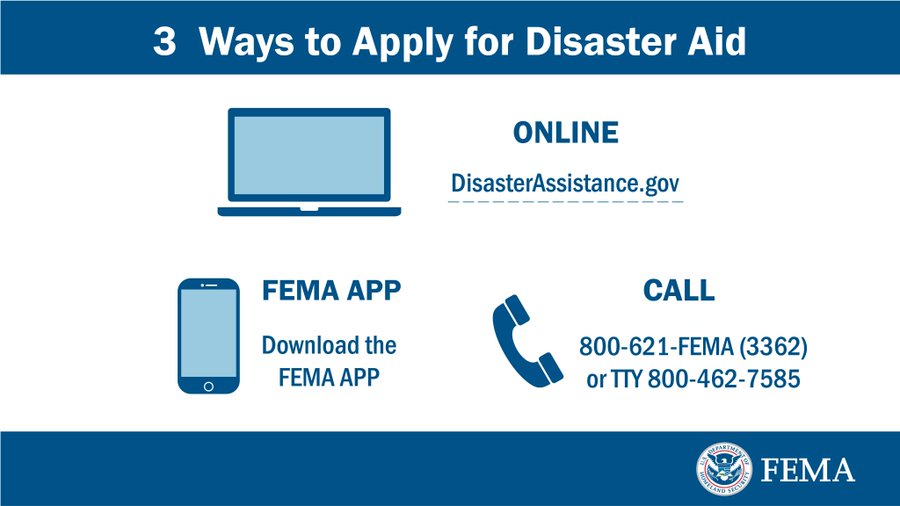 FEMA - Three Ways to Apply for Disaster Aid 09/05/2021 04:10 PM FEMA has provided 3 ways to apply for disaster aid. Check the infographic for details. View larger »